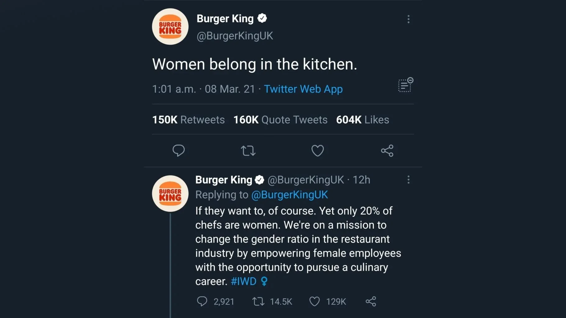 To announce a scholarship program for female chefs on International Women's Day, Burger King UK tweeted "Women belong in the kitchen"—intending this as the first message in a thread explaining their initiative to support women in the culinary industry.